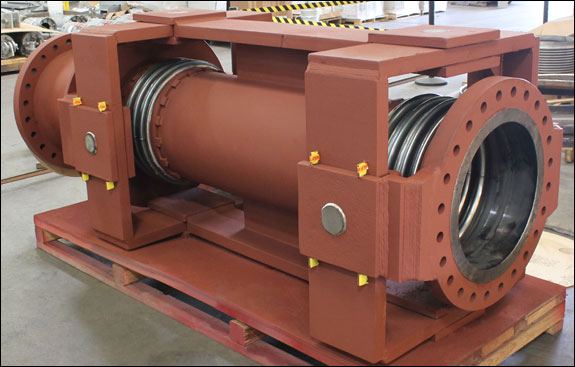Gimbal Expansion Joints are used to absorb angular rotation in any plane, using two pairs of hinges attached to a common floating gimbal ring. This type of construction provides a close control over the movement imposed up on the bellows and also supports the dead weight of the pipe. The wind and shear loads are also taken care of by the gimbal structure. Gimbal bellows joints are designed to absorb the full pressure thrust load of the expansion joint and thus guard the adjacent equipment from damage due to thrust loading.Since gimbal bellows joints are not restricted to a single plane they offer greater flexibility of usage. The gimbal expansion joint is the most reliable expansion joint since it is capable of absorbing angular motion in all the planes. Although single gimbal bellows joint can be used in isolation the most common applications use a pair of gimbal bellows joints to absorb a complex multi-plane motion in a piping system. In adjacent figure Gimbal Expansion Joints are utilized in a pair to absorb the thermal expansion from the two horizontal piping arms. However note that the thermal growth of the vertical leg must be absorbed by the deflection of the horizontal piping.